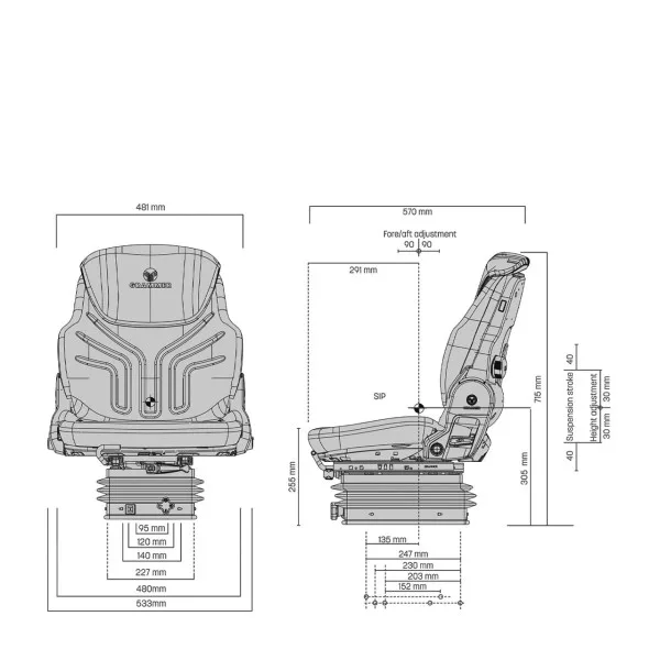 The GRAMMER Compact Basic MSG83/721 seat with narrow mechanical suspension will be ideal for tight spaces in your tractor. The GRAMMER Compact Basic W agricultural seat has a suspension travel of 80 mm as well as manual weight adjustment from 50 to 130 kg. The GRAMMER Compact Basic W agricultural and vineyard seat is equipped with lumbar support for greater comfort. Its upholstery is in anthracite and silver green fabric.